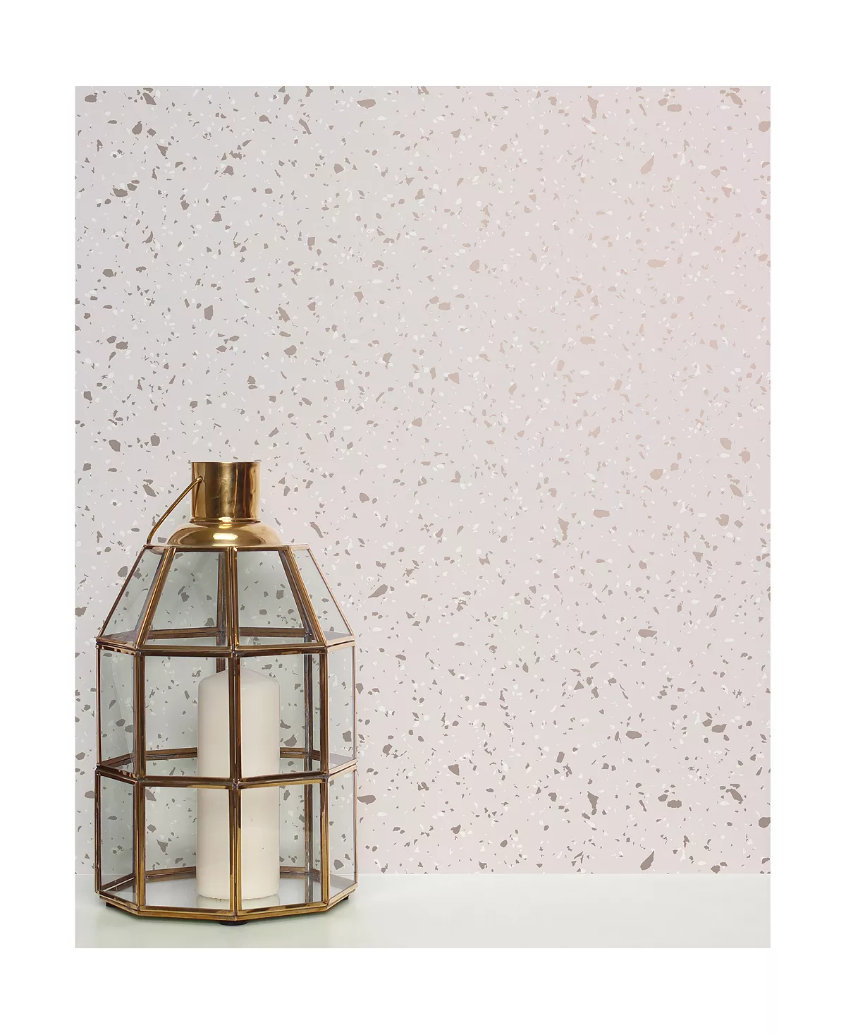Reminiscent of a terrazzo floor, this neutral wallpaper has a sophisticated style. Its speckled design is accented by gold mica details and light pink undertones. Arendal is an unpasted, non woven wallpaper.