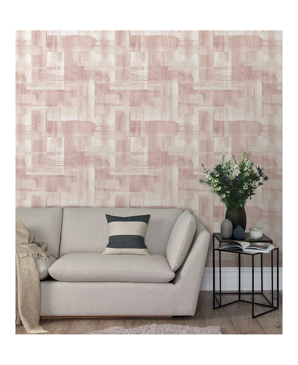 Featuring a brushstroke print, this wallpaper has a textural effect. Its romantic energy is created by soft pink and cream hues. Trosa is an unpasted, non woven wallpaper.