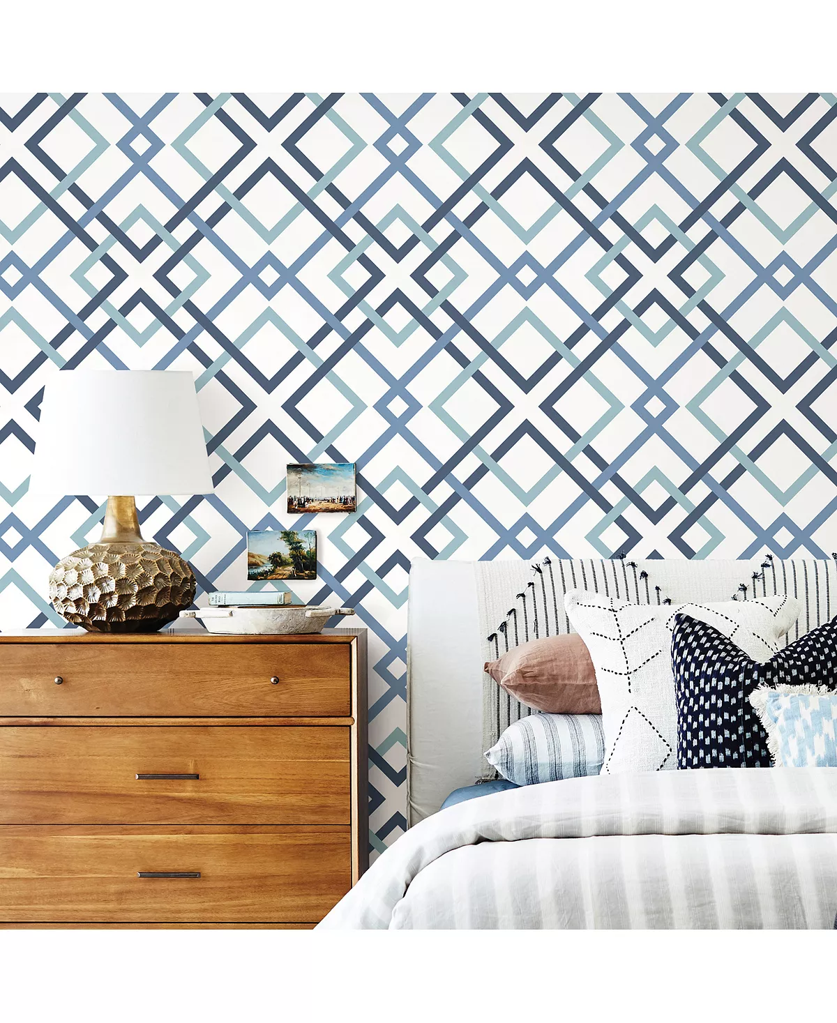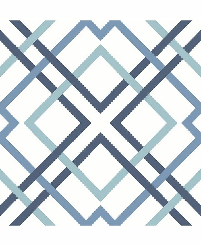 Intersecting squares create a modern trellis design. Soothing hues of aqua, navy and light blue pop against a white background. Saltire emile is an unpasted, non woven wallpaper.