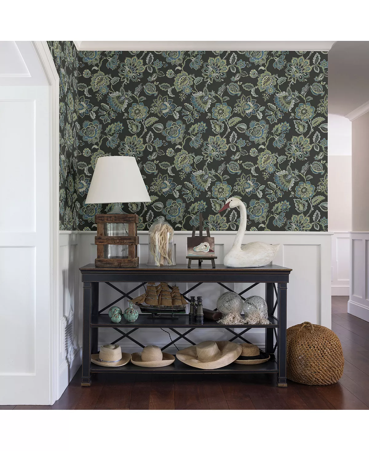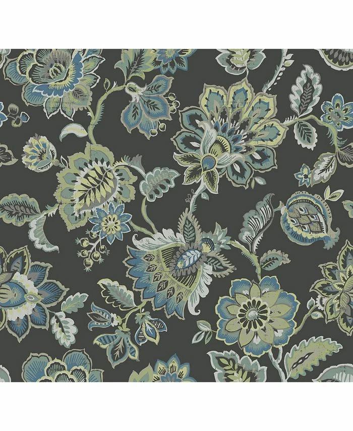 A bold Jacobean print with a lovingly weathered style. Green, turquoise and gray flowers pop against a rich brown background. Corona is an unpasted, non woven wallpaper.