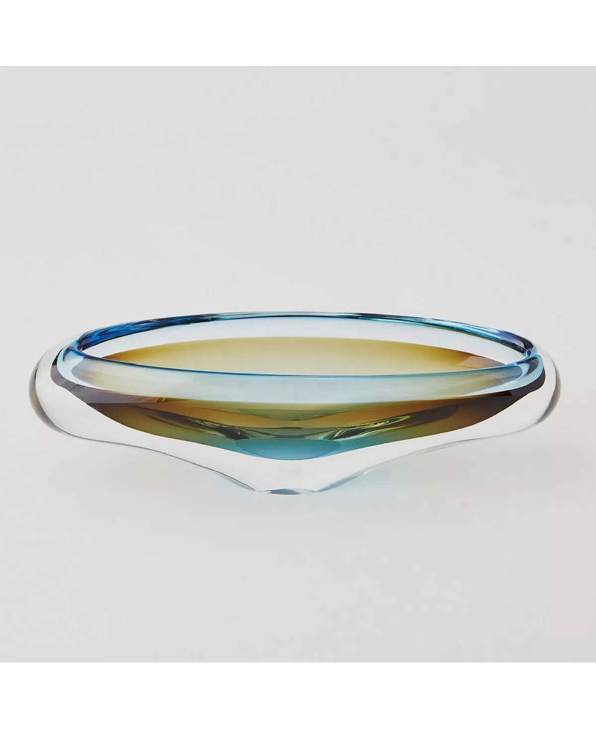 All curved lines and gleaming edges, this exquisite polish art glass bowl is an optical feast. The interior bottom portion is pale amber, and the top edge is a subtle aqua blue – forming a beautiful color reaction where the colors merge. The thick ice base gives the canoe bowl extra weight and presence.