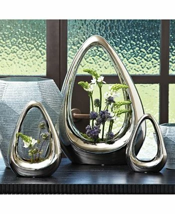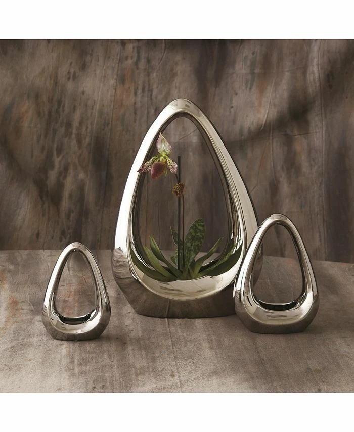 Electroplated silver ceramic make these cute little vases unique. Watertight and great for a traditional or asymmetrical flower arrangement.