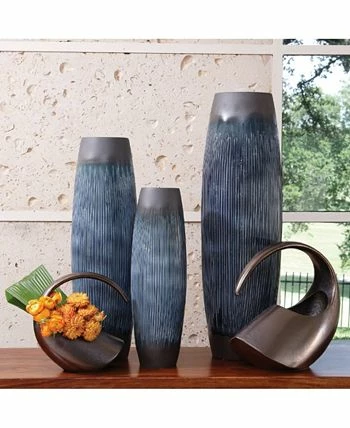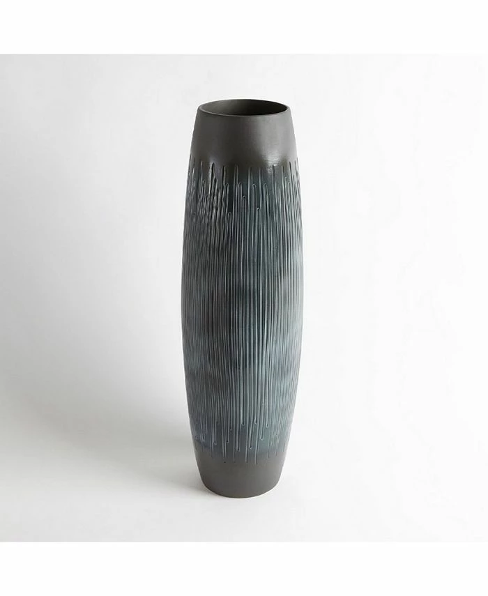 Ink blue reactive glaze over ribbed texture and black porcelain create an almost denim wrap effect on these vases.