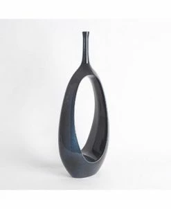 These dramatic silhouettes are extremely difficult to achieve on this scale, but the results are stunning. The height, proportion, and negative space of the ring vases lend to the overall impact of these unique pieces. The celestial color, a rich dark teal or greenish navy tone, is achieved with a multi dimensional reactive glaze.