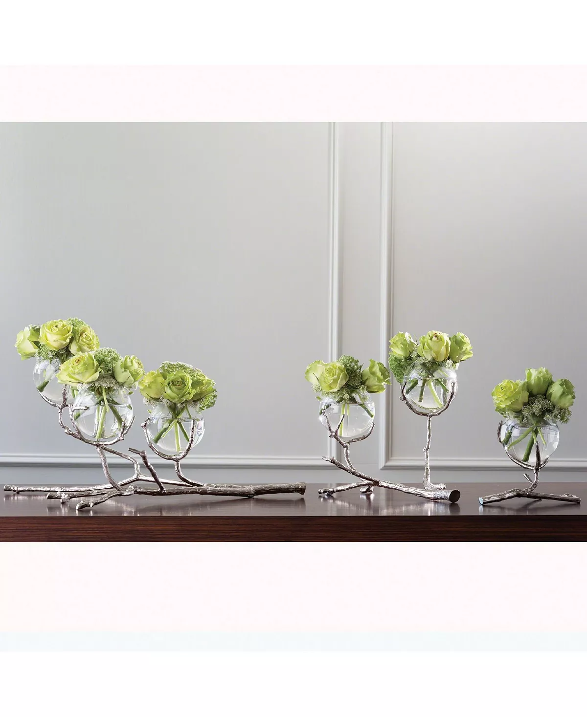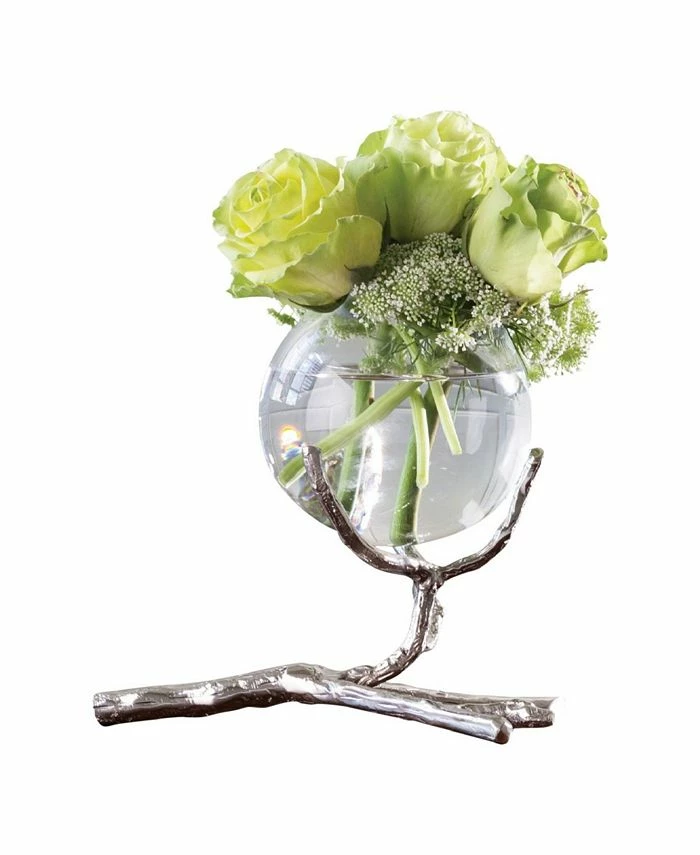 Stems of solid sand-cast brass twist and turn creating our twig vase holders. These delicate vase holders have taken natural elements and turned them into glowing artful accessories. The glass bulb-shaped vases display small buds beautifully. Display one piece for a simple look or show all three sizes together for a dramatic tablescape.