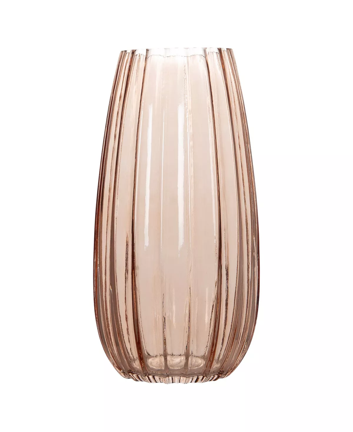 Crafted from glass in a soft blush hue, this ribbed vase will stand out on any surface. Pair with dried florals or fresh blooms. Layer with smaller size for added drama.