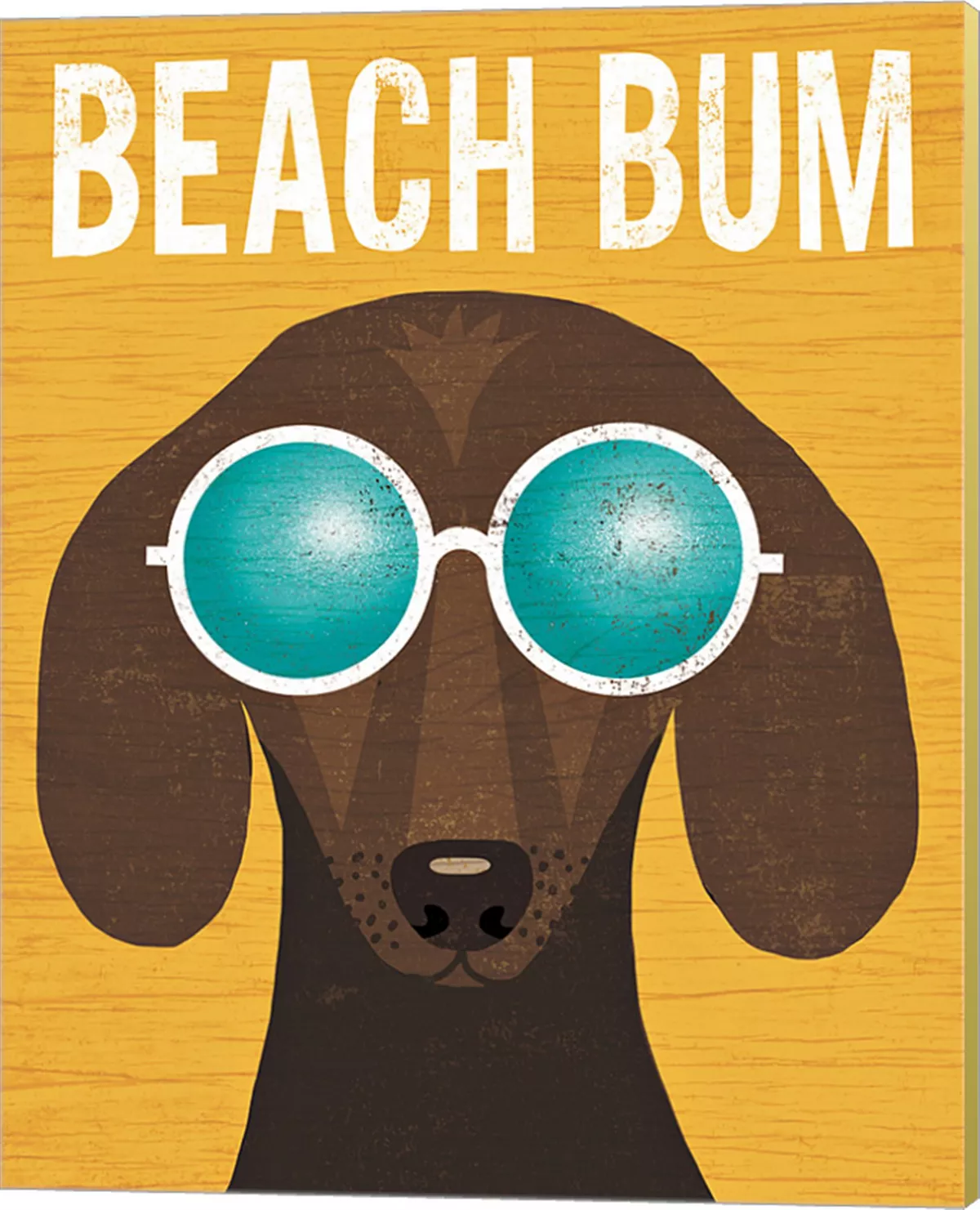 Beach Bums Dachshund I Bum by Michael Mullan is a high quality piece of canvas artwork. The finished size of this piece is 16″ X 20″, and it has a depth 0.75″ with strawflower painted sides. There is a UV protective coating over the entire image, and it is ready to hang on your wall with no hardware required. Hand made in the USA.