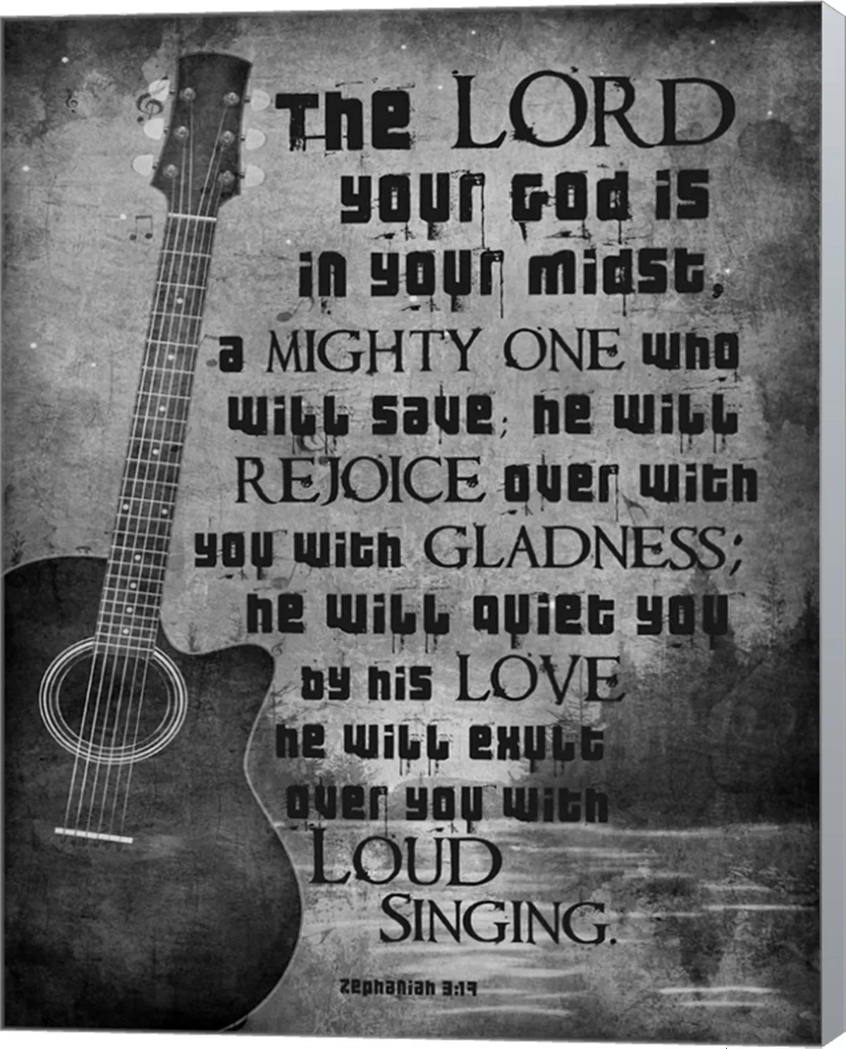 Zephaniah 3-17 The Lord Your God (Guitar Black and White) by Inspire Me is a high quality piece of canvas artwork. The finished size of this piece is 22″ X 28″, and it has a depth 1.5″ with wintergray painted sides. There is a UV protective coating over the entire image, and it is ready to hang on your wall with no hardware required.