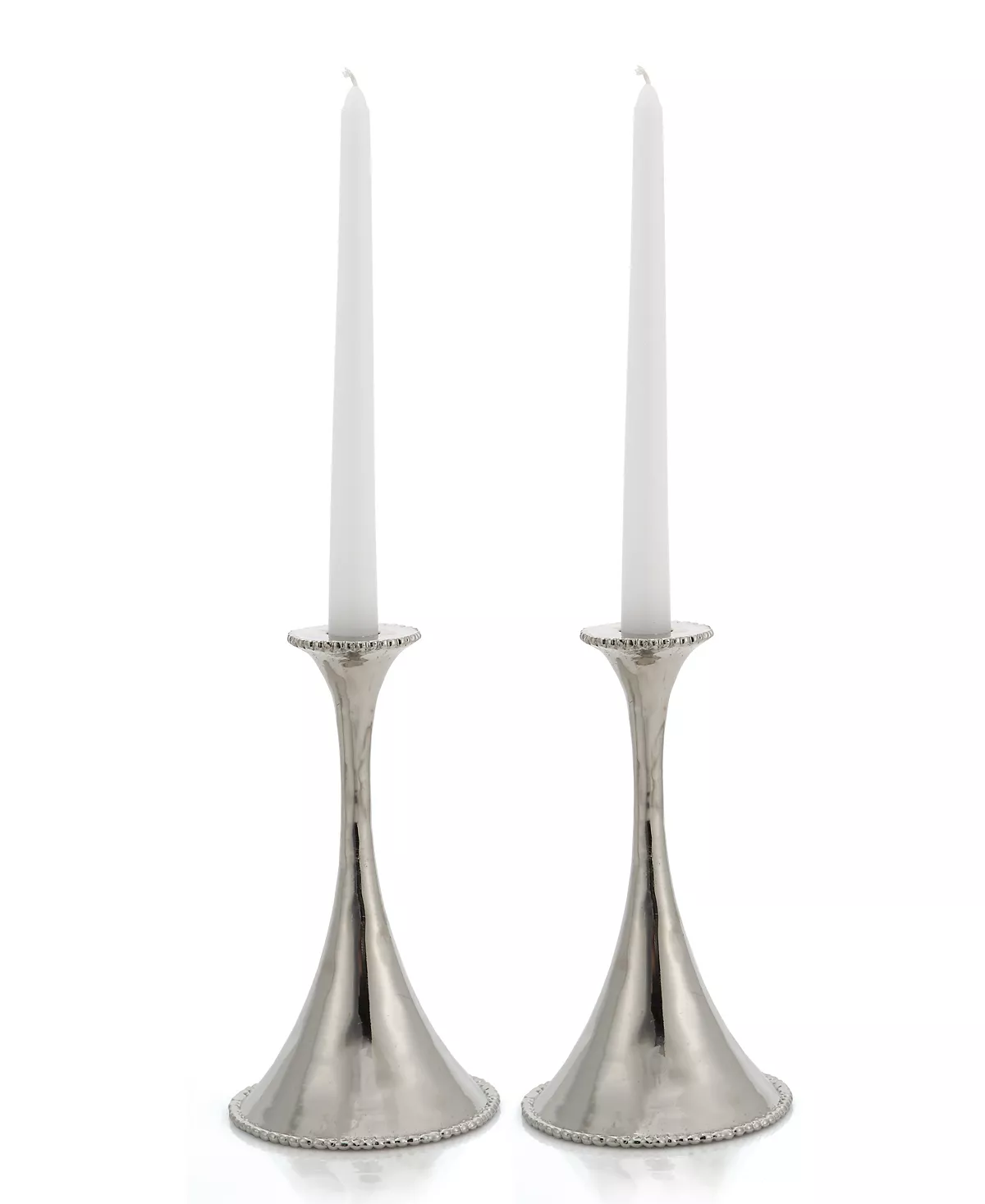 With a dramatic shape and pretty beaded trim in lustrous nickel plate, handcrafted Molten candlesticks illuminate any setting in distinct Michael Aram style.
