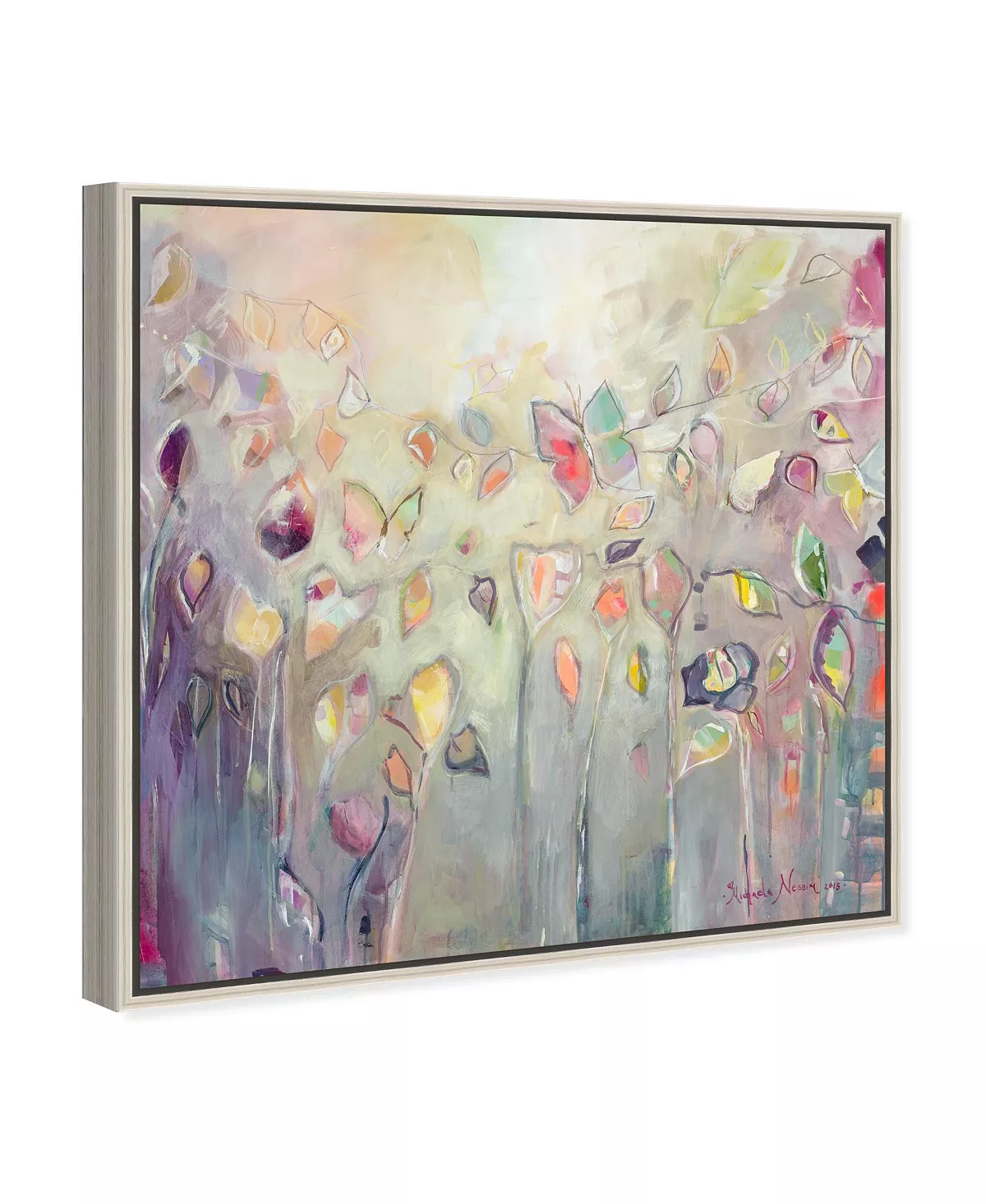 - Hand stretched and professionally framed in a chic antique-like silver-tone floating frame