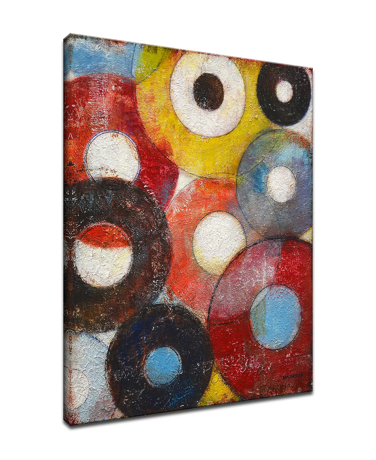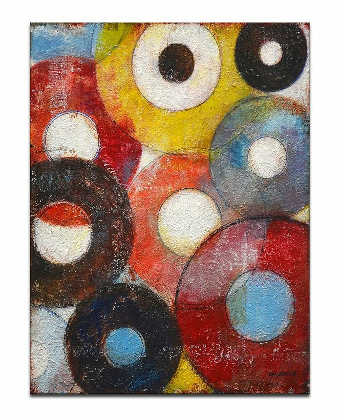“Enhance your home décor with ‘Color Wheels’. This bright canvas art features different hues of red, blue, orange and black all rolling on a canvas of round circular shapes.”