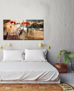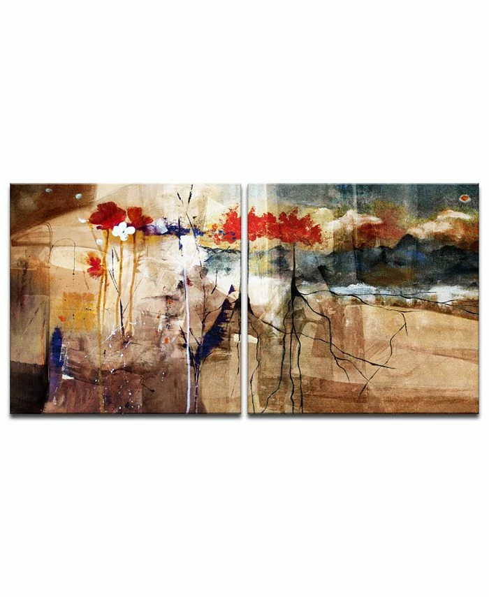 Bold strokes of gray, brown and tan create an abstract background for vibrant red and yellow flowers in Ready2HangArt’s Floral printed artwork spread across two canvas panels.