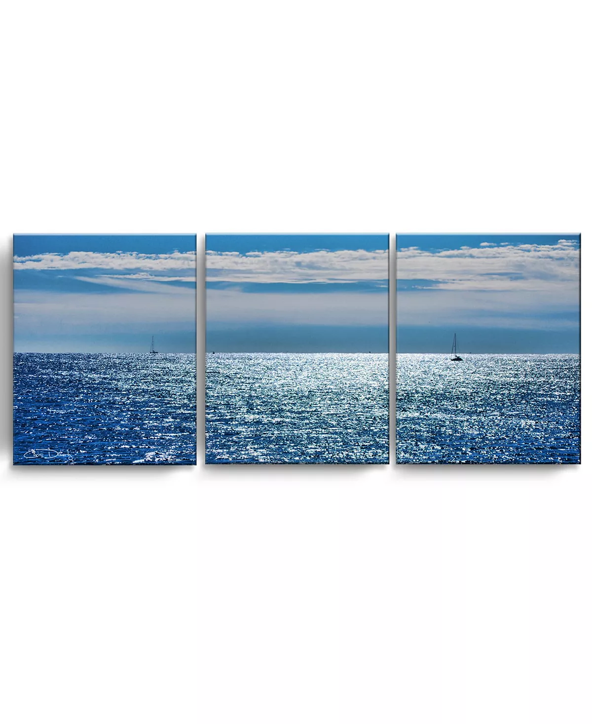 The oceans canvas art depicts a horizon of lustrously blue sea, the sun shimmering from overhead and two lone sailboats in the distance. Bring the beauty of nature to your decor with this stunning wall art.