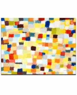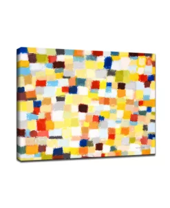 This artwork features an abstract digital view of ‘Perception Blanket’. This panel art is a colorful piece with hues of orange, yellow, blue, and white dancing in a patch shape on a canvas.