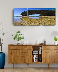 The aqua rocks II 3 piece canvas art set depicts the luminous reflection of natural rocky terrain against the sea on a lustrous day. Bring the beauty of nature to your decor with this stunning wall art.