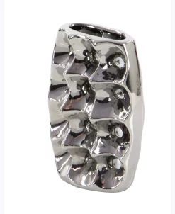 - Modern round ceramic vases showcase a polished and hammered silver ceramic finish