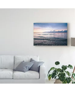 This ready to hang, gallery-wrapped art piece features a sunset over clouds on a coastline. Gallery-wrap is a method of wrapping an artist’s canvas around a hidden, wooden frame allowing for a frameless presentation.