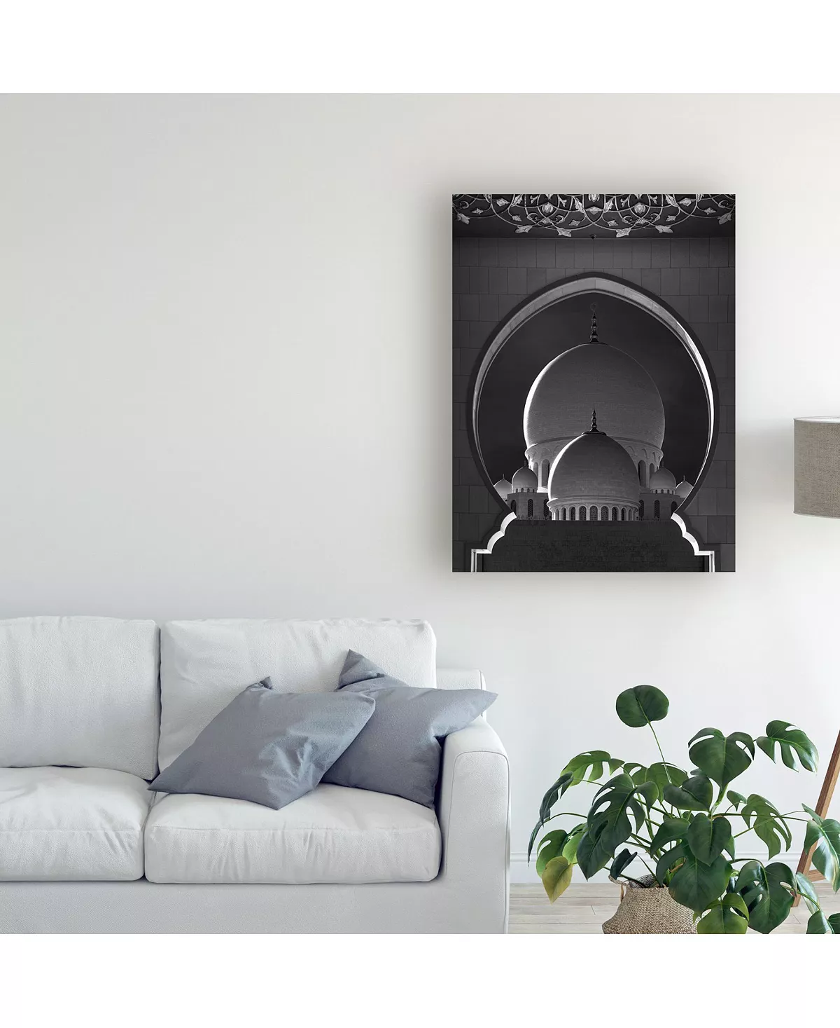 This ready to hang, gallery-wrapped art piece features tall white domes on a mosque. Gallery-wrap is a method of wrapping an artist’s canvas around a hidden, wooden frame allowing for a frameless presentation.