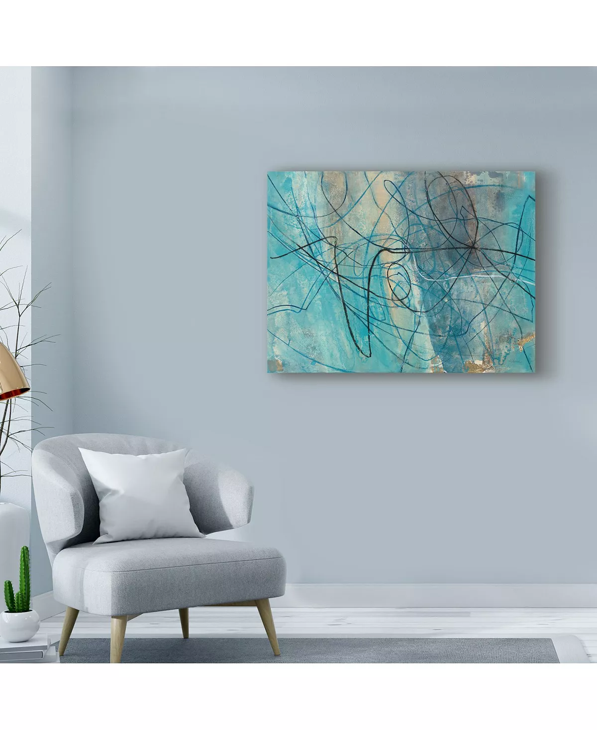 This ready to hang, gallery-wrapped art piece features black and blue scribbles over a background of teal, cream, and grey. Gallery-wrap is a method of wrapping an artist’s canvas around a hidden, wooden frame allowing for a frameless presentation.