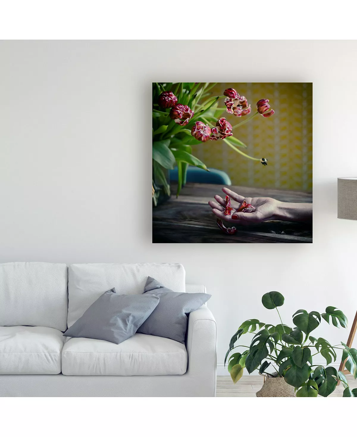 This ready to hang, gallery-wrapped art piece features pink flowers on the left side of a table. Gallery-wrap is a method of wrapping an artist’s canvas around a hidden, wooden frame allowing for a frameless presentation.