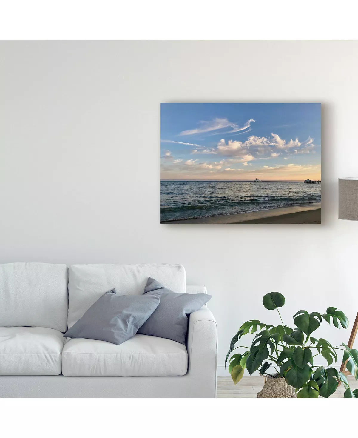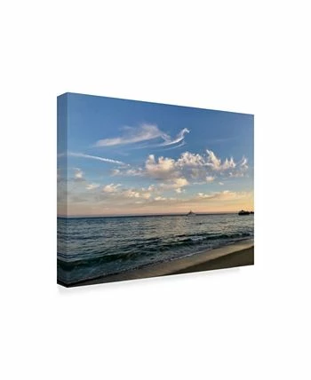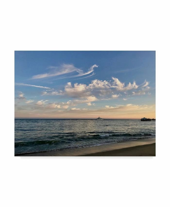 This ready to hang, gallery-wrapped art piece features clouds in the sky over the ocean. Gallery-wrap is a method of wrapping an artist’s canvas around a hidden, wooden frame allowing for a frameless presentation.