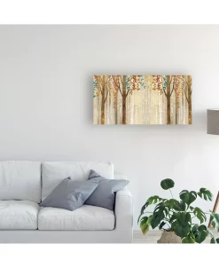 This ready to hang, gallery-wrapped art piece features thin brown and grey tree trunks with hints or yellow, orange, red, and teal leaves. This art is gallery-wrapped, which allows for a frameless presentation.