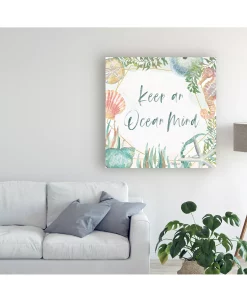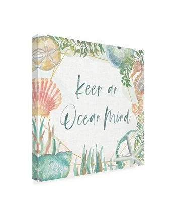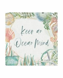 This ready to hang, gallery-wrapped art piece features the phrase “Keep an Ocean Mind” surrounded by pink shells and teal seaweed. Gallery-wrap is a method of wrapping an artist’s canvas around a hidden, wooden frame allowing for a frameless presentation.