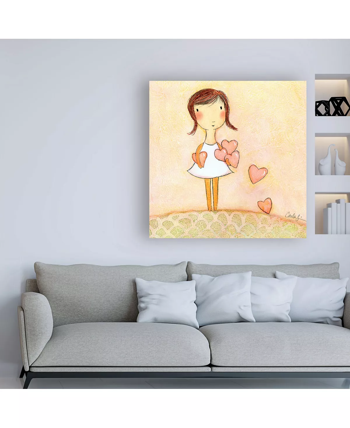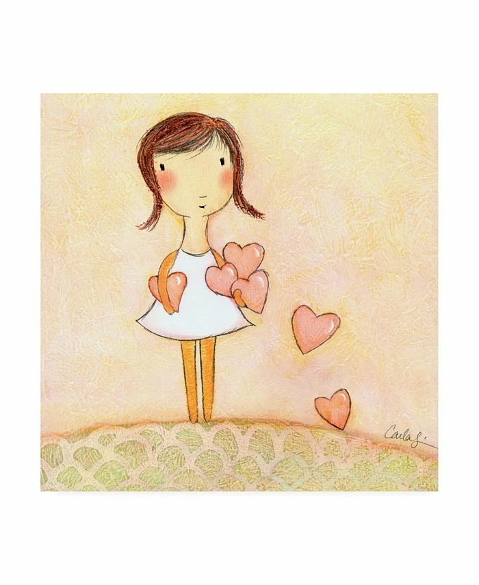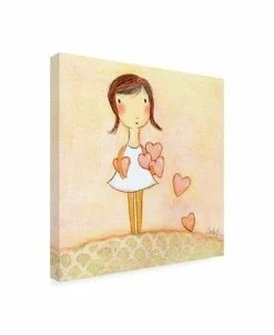 This ready to hang, gallery-wrapped art piece features a girl with hearts in the center of the frame. Gallery-wrap is a method of wrapping an artist’s canvas around a hidden, wooden frame allowing for a frameless presentation.
