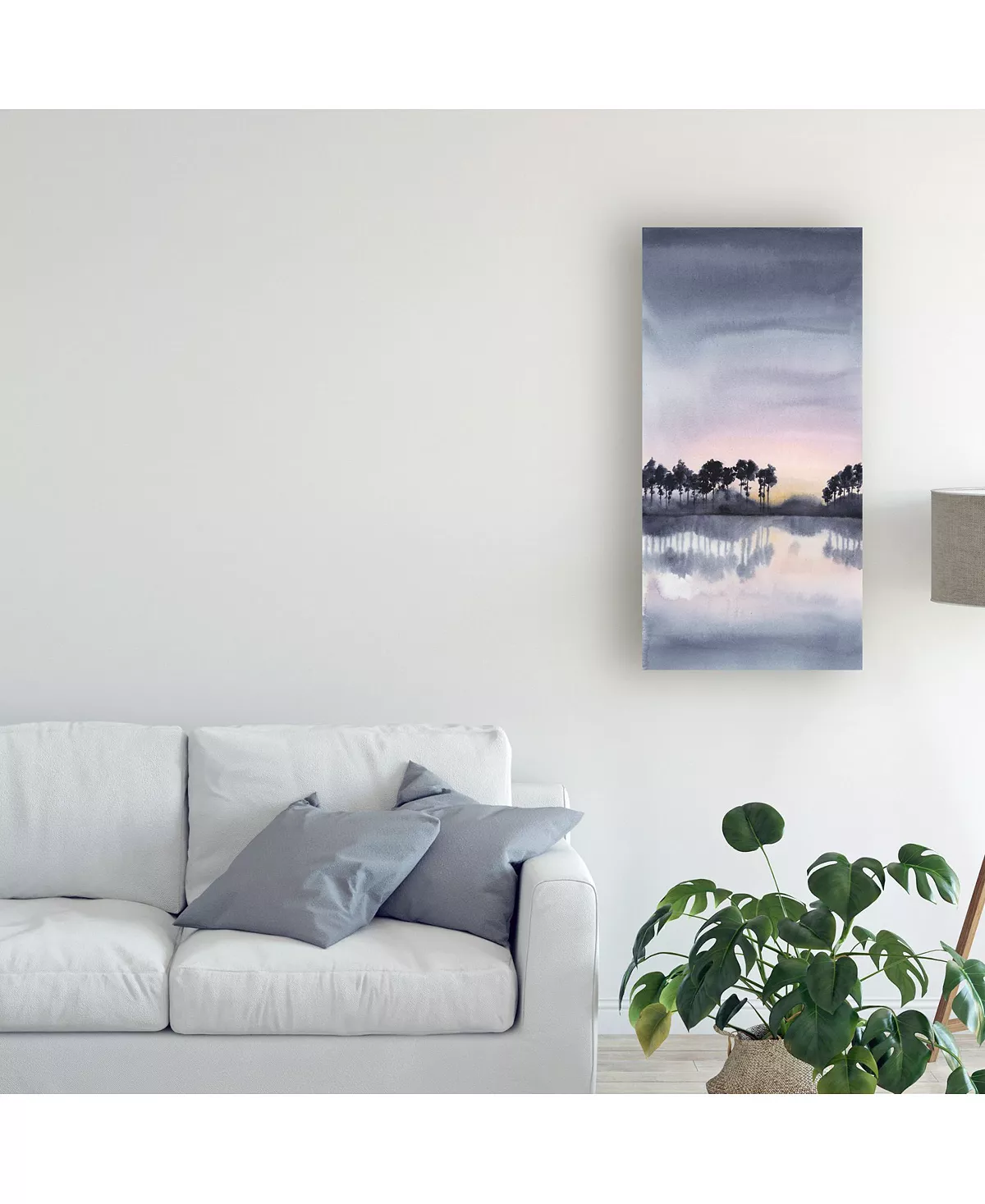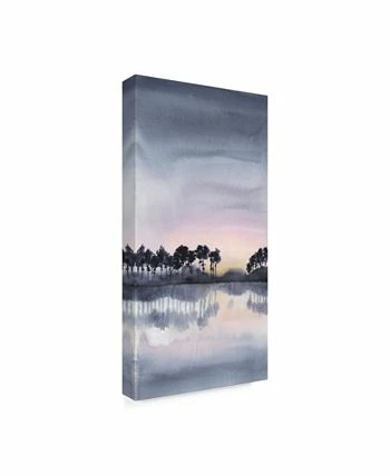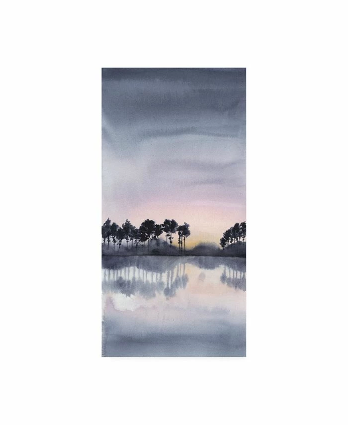 This ready to hang, gallery-wrapped art piece features a black painted silhouette of a forest over gray. Gallery-wrap is a method of wrapping an artist’s canvas around a hidden, wooden frame allowing for a frameless presentation.