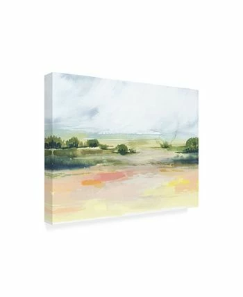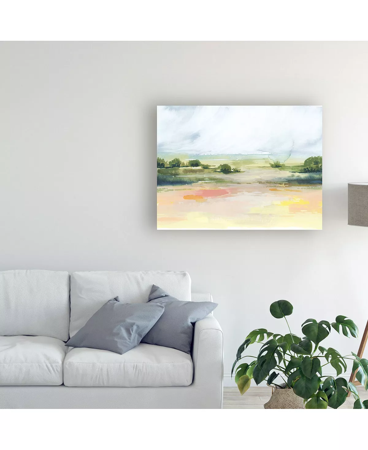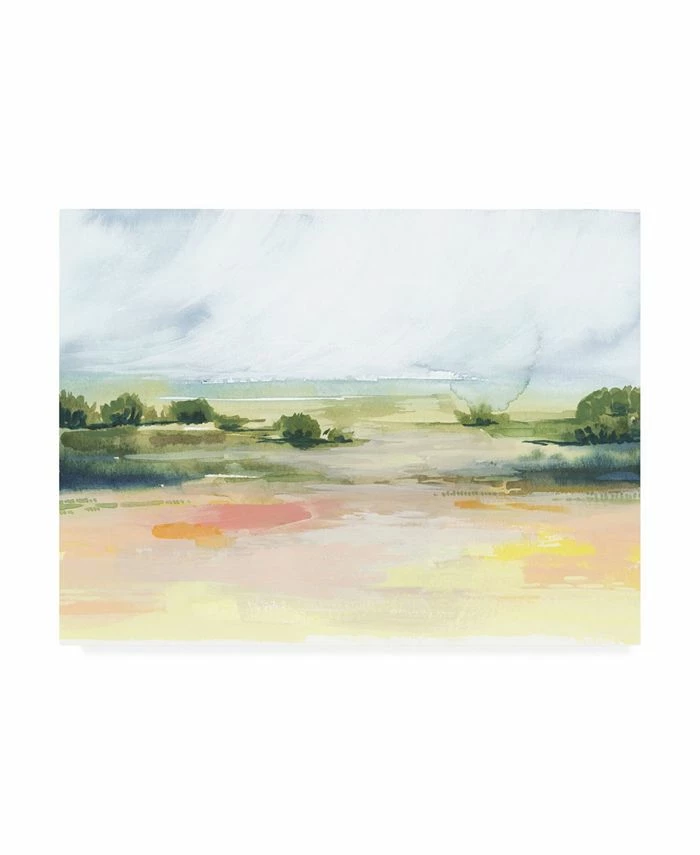 This ready to hang, gallery-wrapped art piece features a yellow and green landscape under a blue sky. Gallery-wrap is a method of wrapping an artist’s canvas around a hidden, wooden frame allowing for a frameless presentation.
