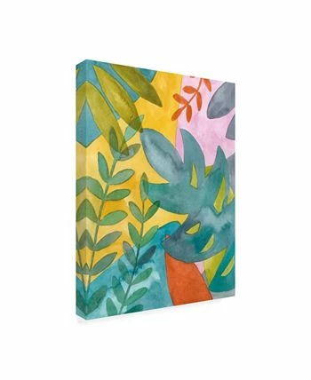 This ready to hang, gallery-wrapped art piece features large tropical leaves over a bright background. Gallery-wrap is a method of wrapping an artist’s canvas around a hidden, wooden frame allowing for a frameless presentation.