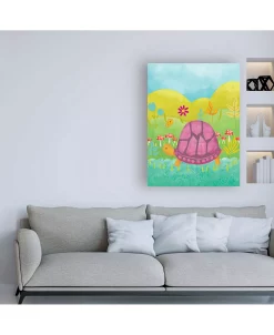 This ready to hang, gallery-wrapped art piece features an orange and pink turtle in the center of the frame. Gallery-wrap is a method of wrapping an artist’s canvas around a hidden, wooden frame allowing for a frameless presentation.
