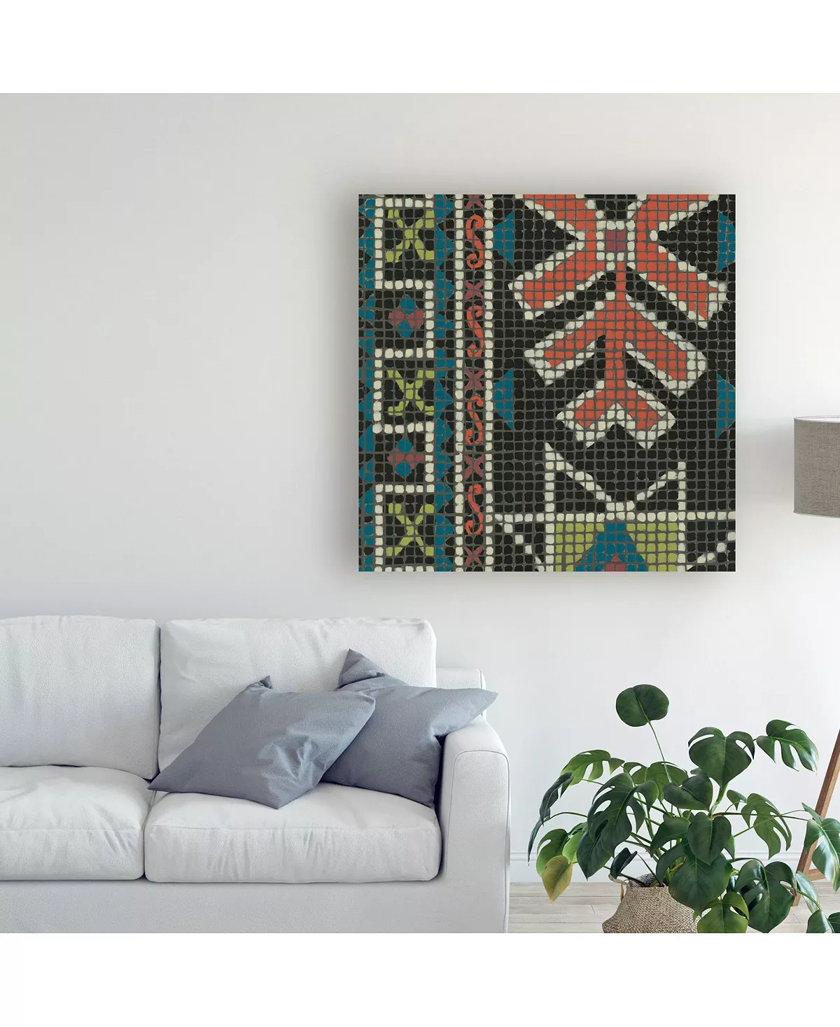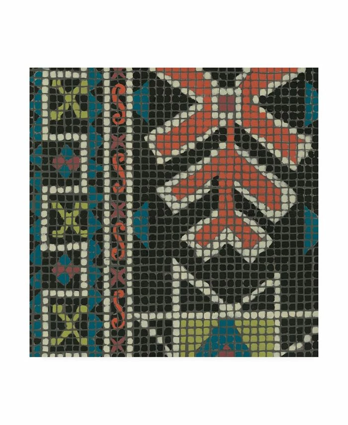 This ready to hang, gallery-wrapped art piece features a woven geometric design in shades of teal, green, and red on black. Gallery-wrap is a method of wrapping an artist’s canvas around a hidden, wooden frame allowing for a frameless presentation.