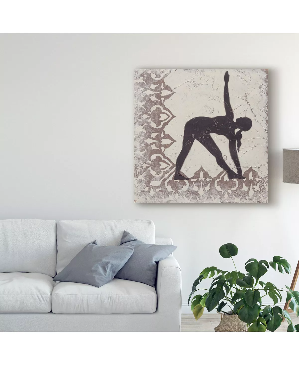 This ready to hang, gallery-wrapped art piece features a silhouette of a woman doing yoga. Gallery-wrap is a method of wrapping an artist’s canvas around a hidden, wooden frame allowing for a frameless presentation.