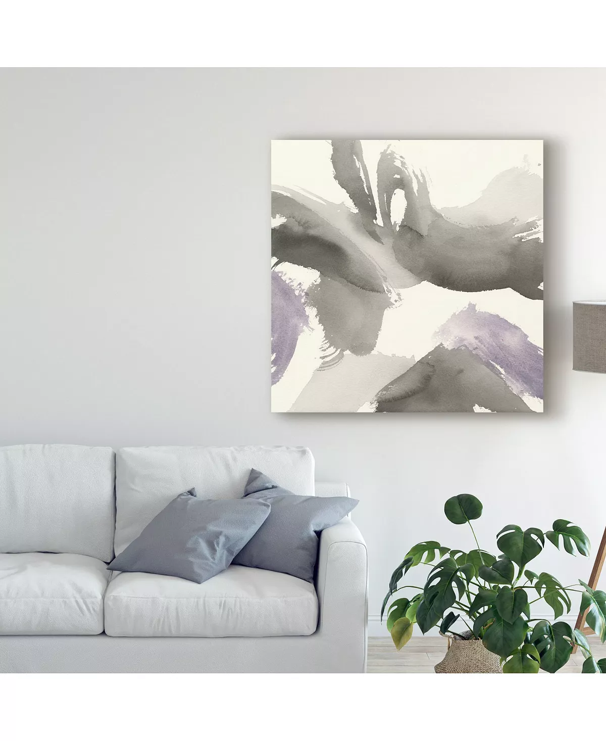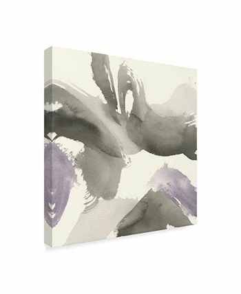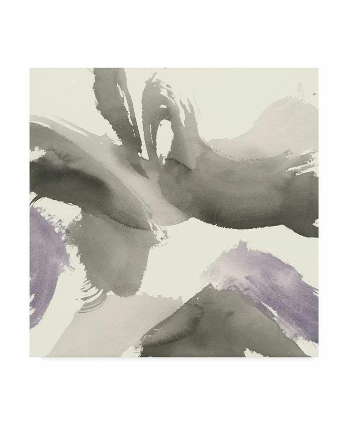 This ready to hang, gallery-wrapped art piece features grey and purple streaks of paint on a cream background. Gallery-wrap is a method of wrapping an artist’s canvas around a hidden, wooden frame allowing for a frameless presentation.