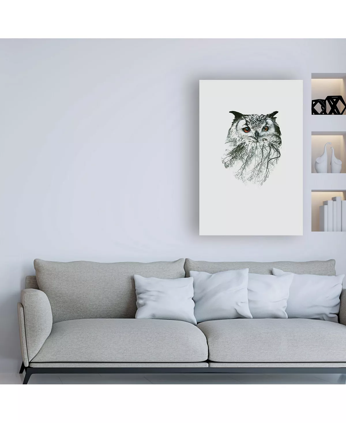 This ready to hang, gallery-wrapped art piece features a portrait of an owl over a white background. Gallery-wrap is a method of wrapping an artist’s canvas around a hidden, wooden frame allowing for a frameless presentation.
