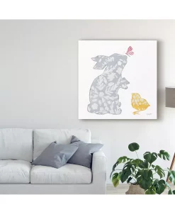 This ready to hang, gallery-wrapped art piece features rabbit, chick, and butterfly silhouettes in grey, pink, and yellow patterns. Gallery-wrap is a method of wrapping an artist’s canvas around a hidden, wooden frame allowing for a frameless presentation.