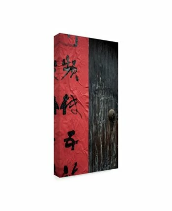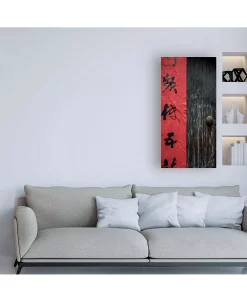 This ready to hang, gallery-wrapped art piece features black symbols on a red background. Gallery-wrap is a method of wrapping an artist’s canvas around a hidden, wooden frame allowing for a frameless presentation.