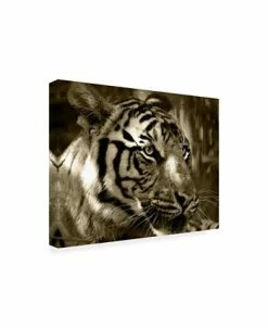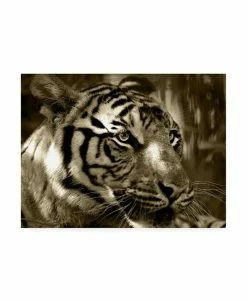 This ready to hang, gallery-wrapped art piece features a black and white close up photograph of a tiger. Gallery-wrap is a method of wrapping an artist’s canvas around a hidden, wooden frame allowing for a frameless presentation.