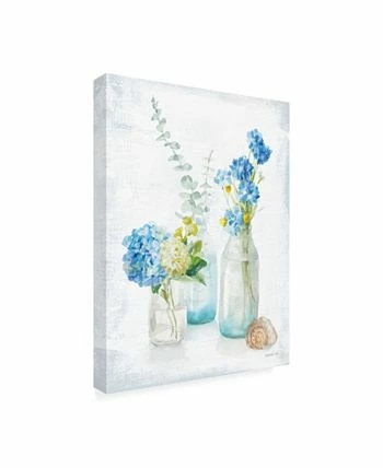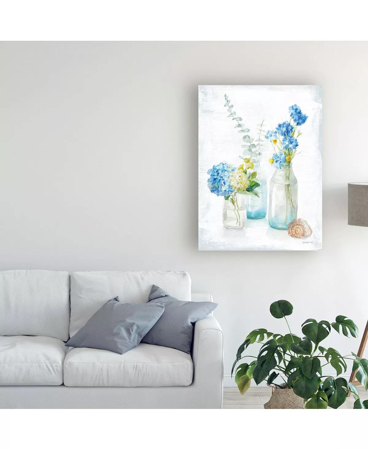 This ready to hang, gallery-wrapped art piece features a seashell beside glass bottles full of blue and white flowers. Gallery-wrap is a method of wrapping an artist’s canvas around a hidden, wooden frame allowing for a frameless presentation.