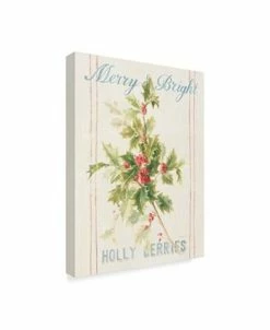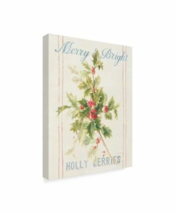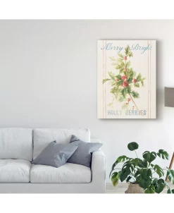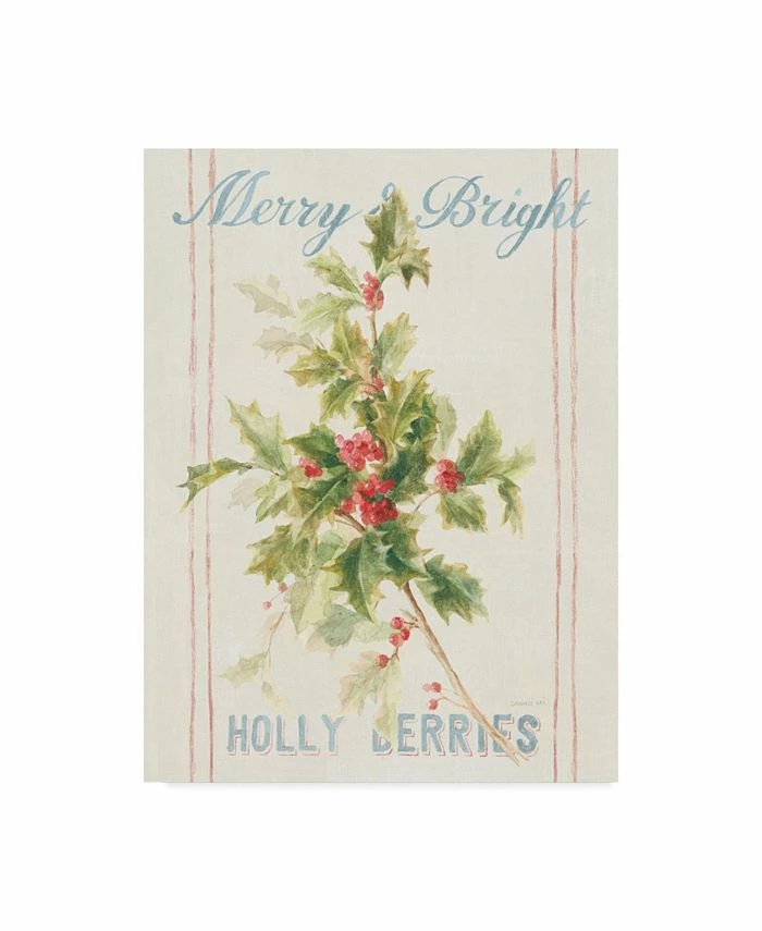 This ready to hang, gallery-wrapped art piece features the words “Merry and Bright” in light blue letters over holly on cream fabric with thin red stripes. This art is gallery-wrapped, which allows for a frameless presentation.