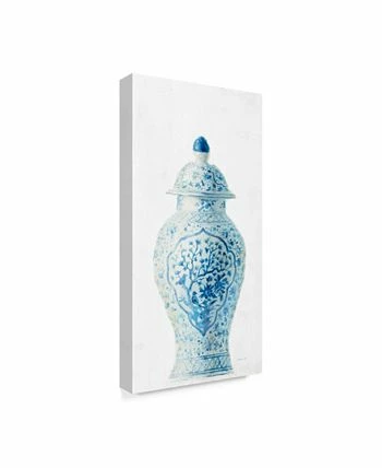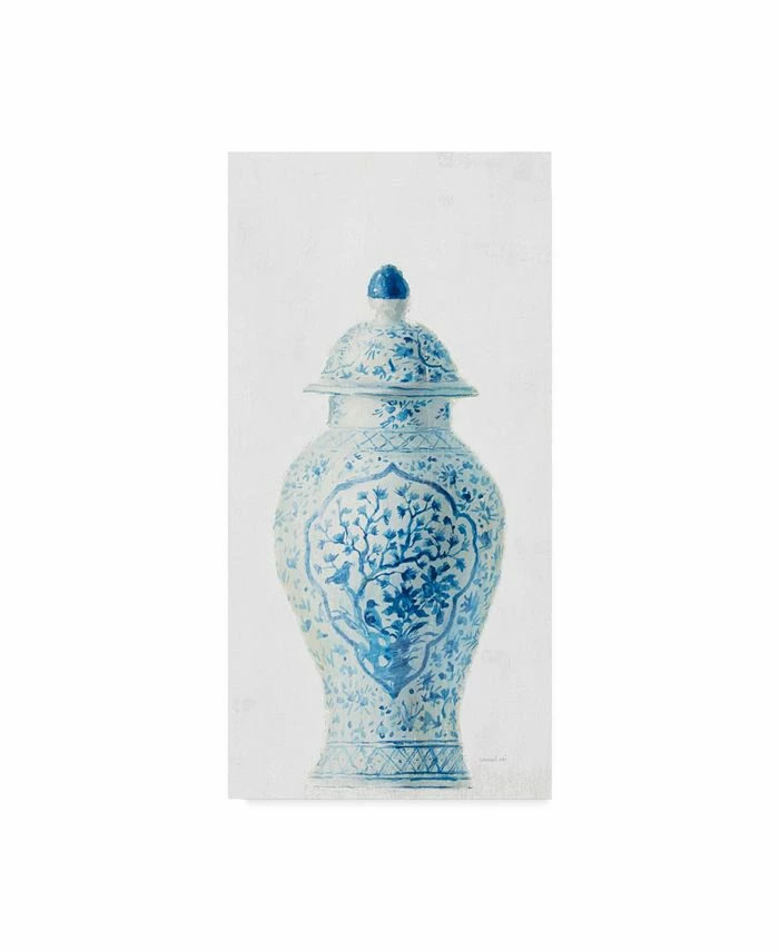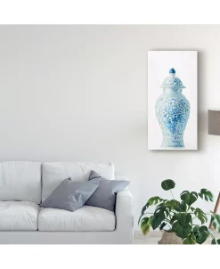 This ready to hang, gallery-wrapped art piece features a white vase with blue designs on a white background. Gallery-wrap is a method of wrapping an artist’s canvas around a hidden, wooden frame allowing for a frameless presentation.