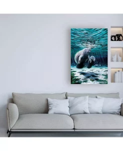 This ready to hang, gallery-wrapped art piece features manatees swimming together under the water with rays of light. Gallery-wrap is a method of wrapping an artist’s canvas around a hidden, wooden frame allowing for a frameless presentation.