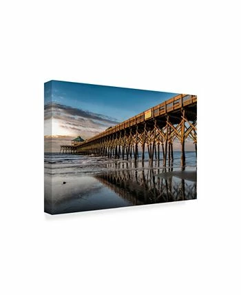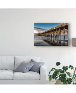 This ready to hang, gallery-wrapped art piece features a long pier under a blue sky. Gallery-wrap is a method of wrapping an artist’s canvas around a hidden, wooden frame allowing for a frameless presentation.