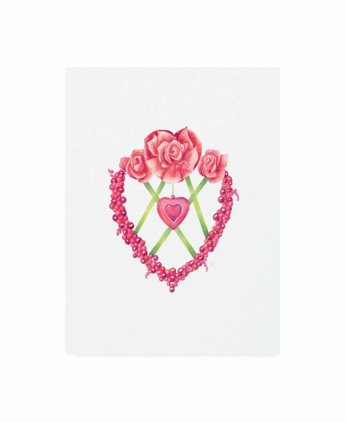 This ready to hang, gallery-wrapped art piece features pink roses and hearts in the overall shape of a heart. Gallery-wrap is a method of wrapping an artist’s canvas around a hidden, wooden frame allowing for a frameless presentation.