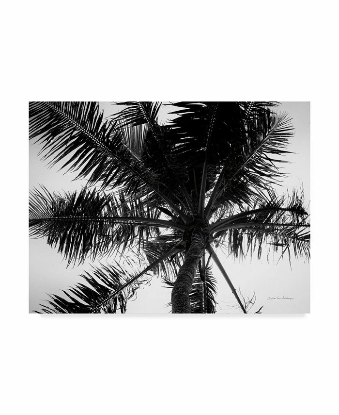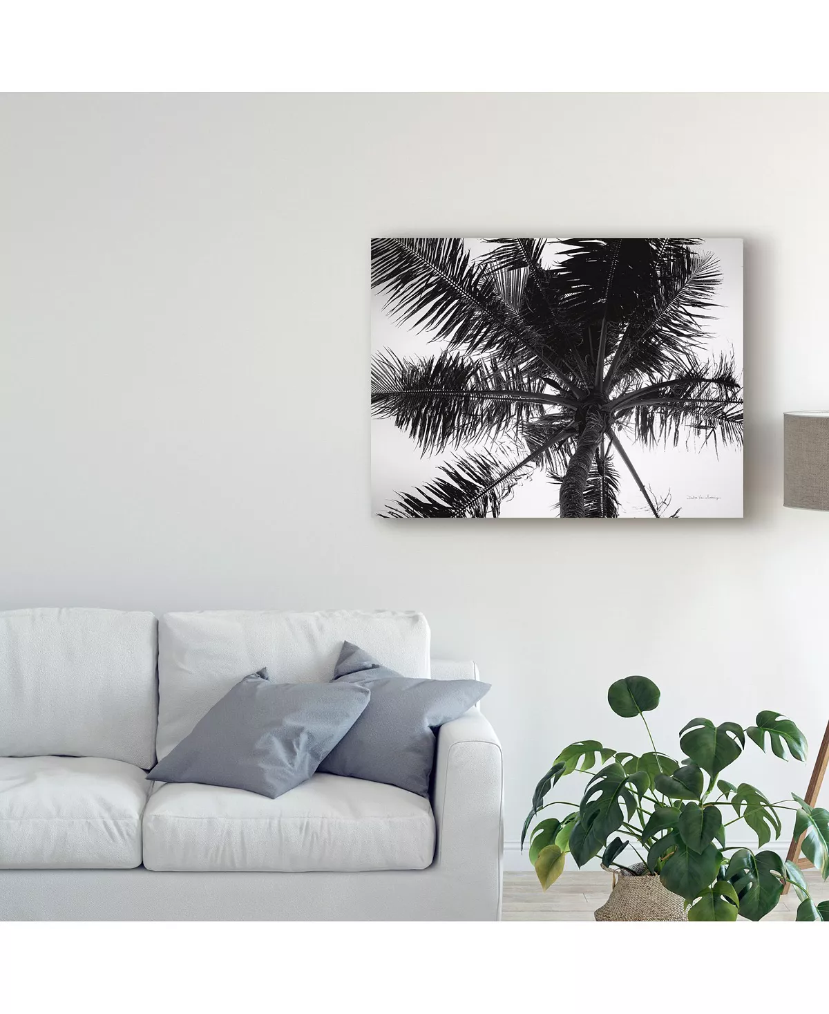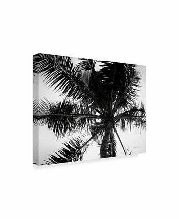 This ready to hang, gallery-wrapped art piece features a black and white photograph of palm trees against a sunny sky. Gallery-wrap is a method of wrapping an artist’s canvas around a hidden, wooden frame allowing for a frameless presentation.