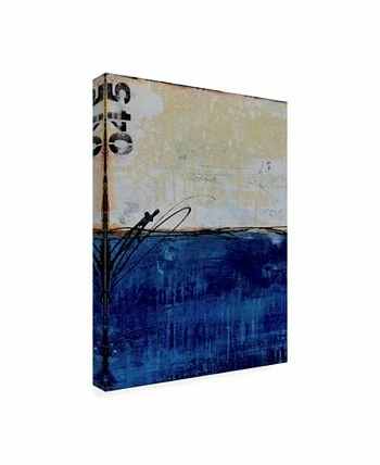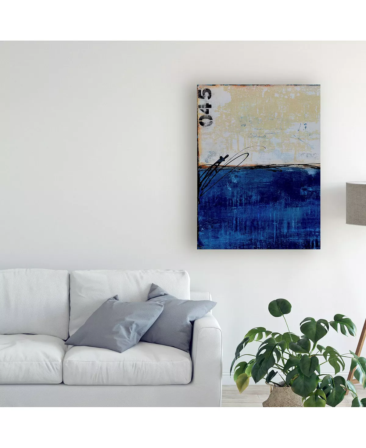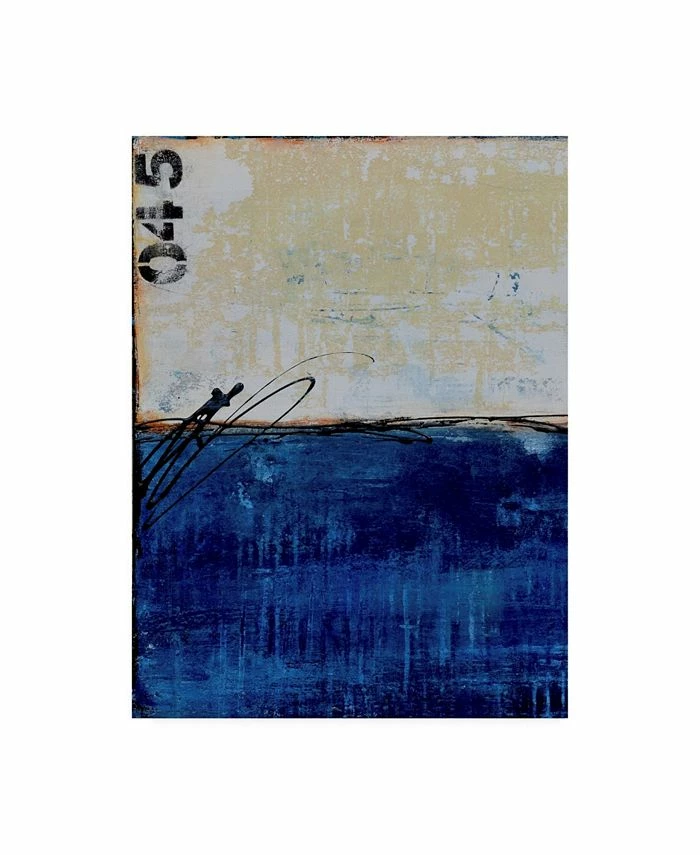 This ready to hang, gallery-wrapped art piece features blue and beige abstract paint filling the frame. Gallery-wrap is a method of wrapping an artist’s canvas around a hidden, wooden frame allowing for a frameless presentation.