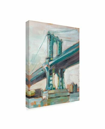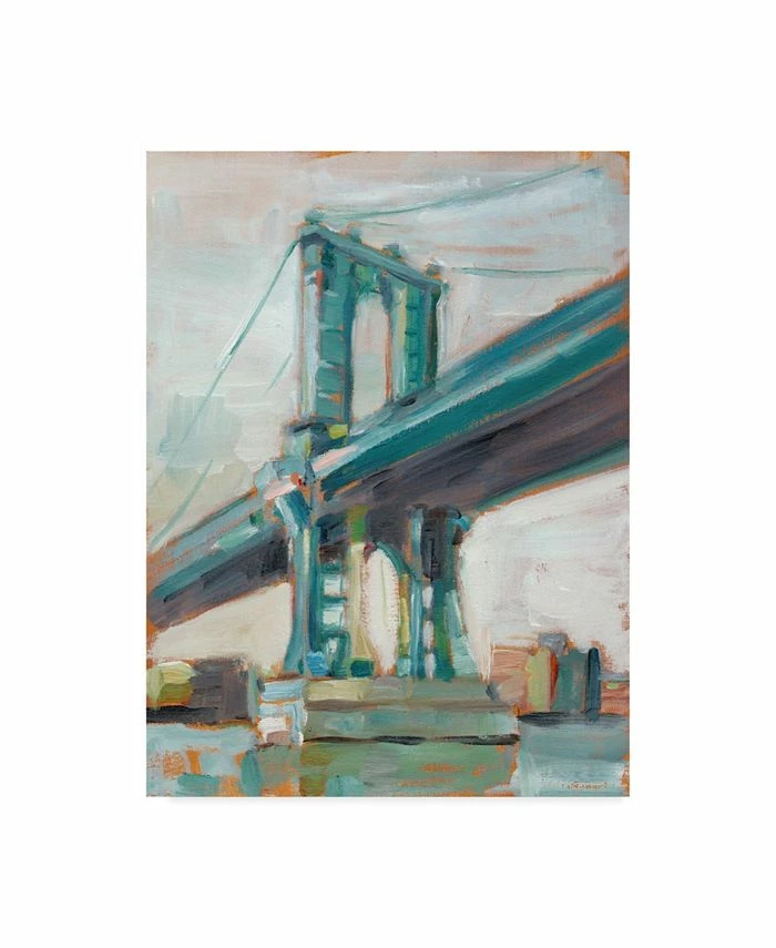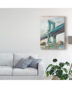 This ready to hang, gallery-wrapped art piece features a blue bridge in the center of the frame. Gallery-wrap is a method of wrapping an artist’s canvas around a hidden, wooden frame allowing for a frameless presentation.
