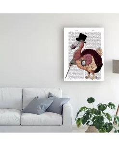 This ready to hang, gallery-wrapped art piece features a dodo with a hat on over a book page. Gallery-wrap is a method of wrapping an artist’s canvas around a hidden, wooden frame allowing for a frameless presentation.