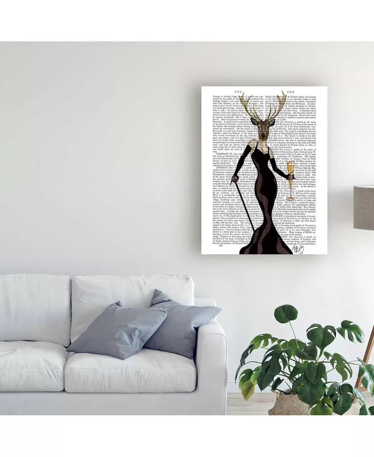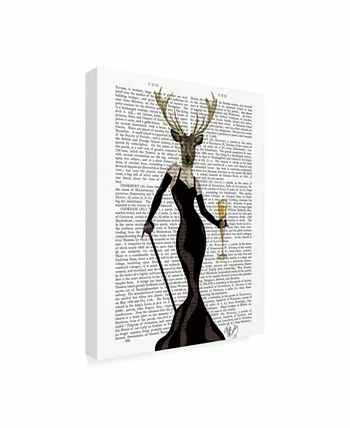 This ready to hang, gallery-wrapped art piece features a deer with a dress on in the center of the frame. Gallery-wrap is a method of wrapping an artist’s canvas around a hidden, wooden frame allowing for a frameless presentation.